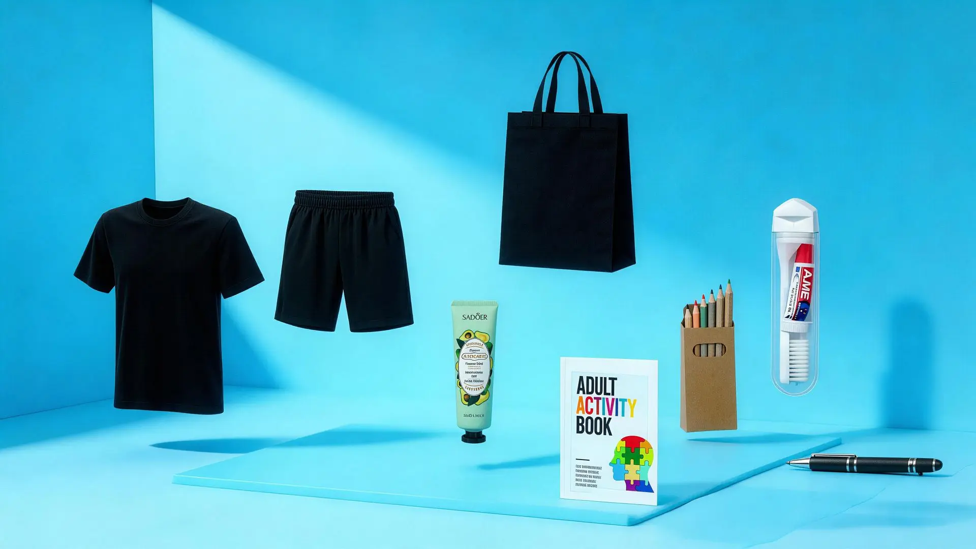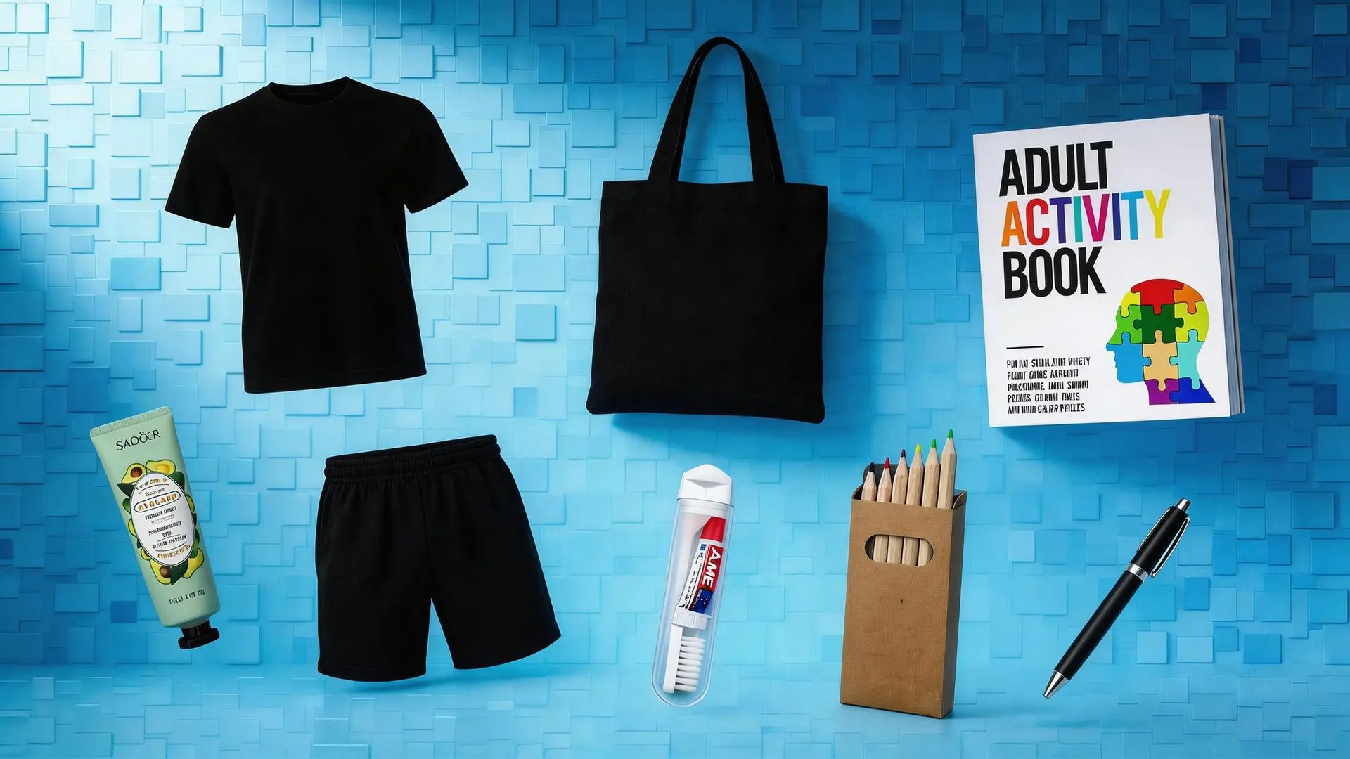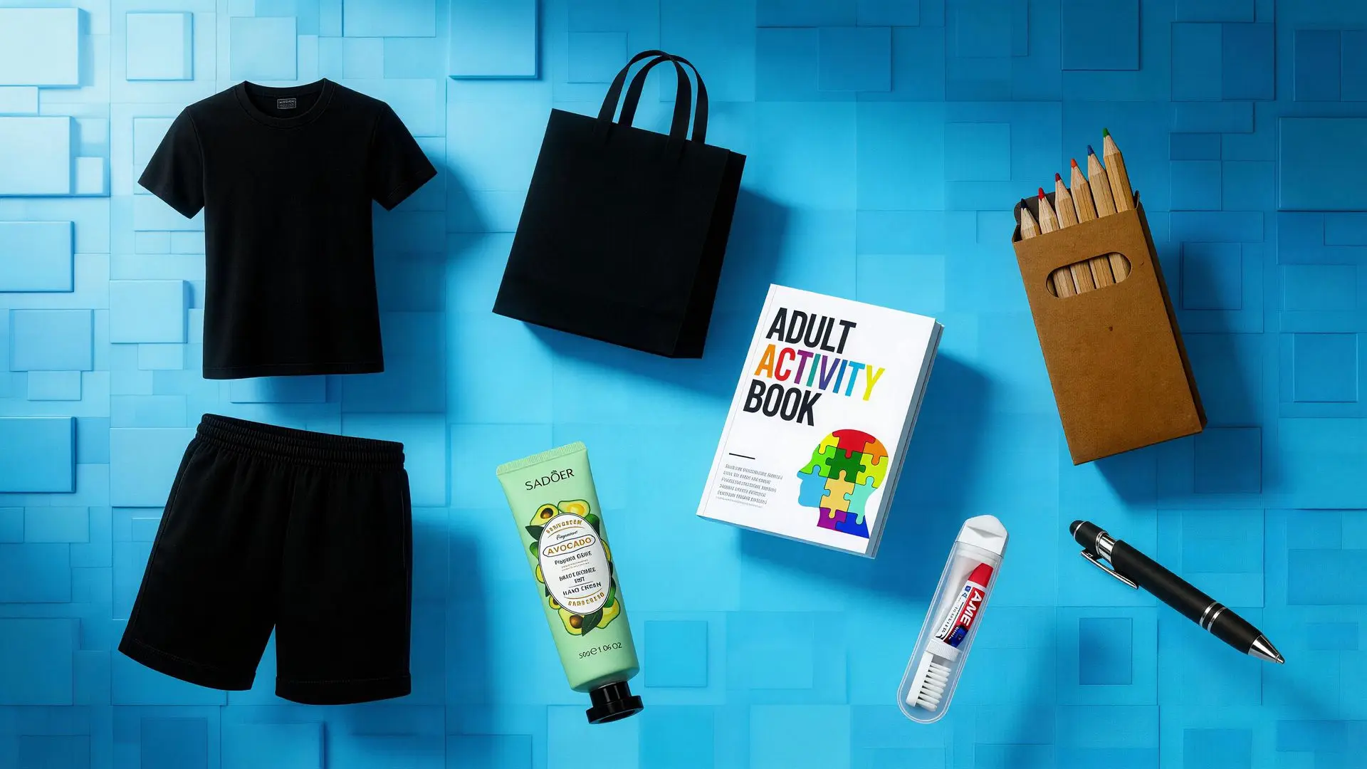 • Comfort & Leisure: Neutral hand cream, an activity book, and a set of coloring pencils.